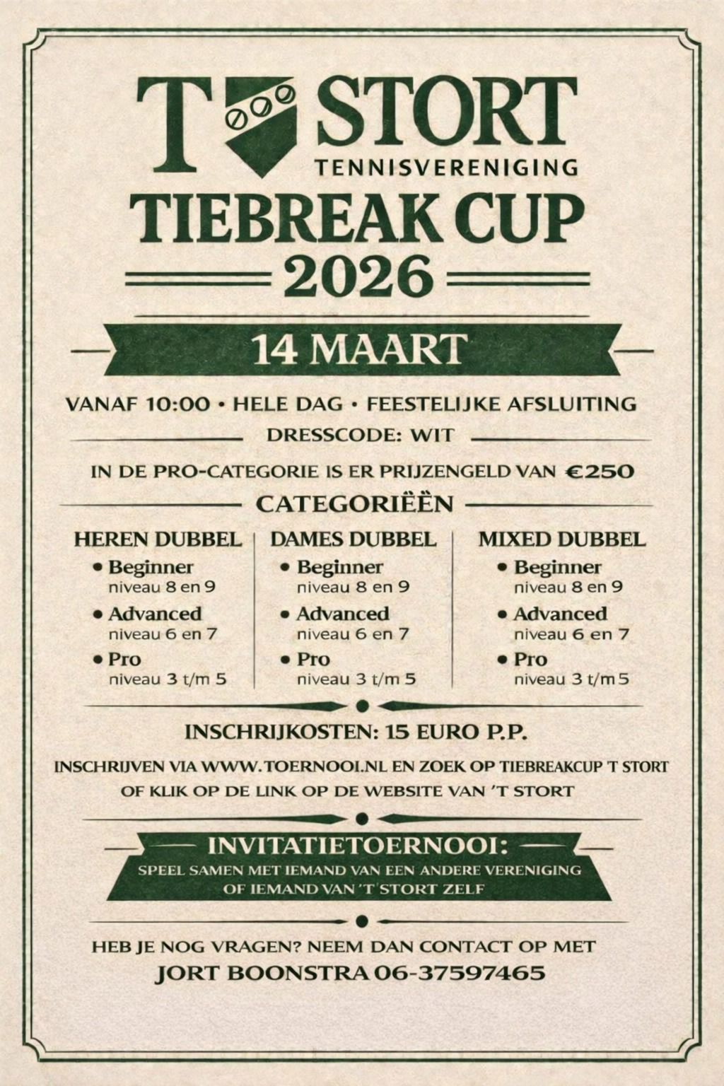 Goed om te weten! De Tiebreak Cup is een invitatietoernooi. Dat betekent dat je dit toernooi ook met iemand van een andere vereniging, geen vereniging of jouw trainingsmaatje van 't Stort mag spelen.